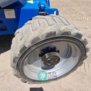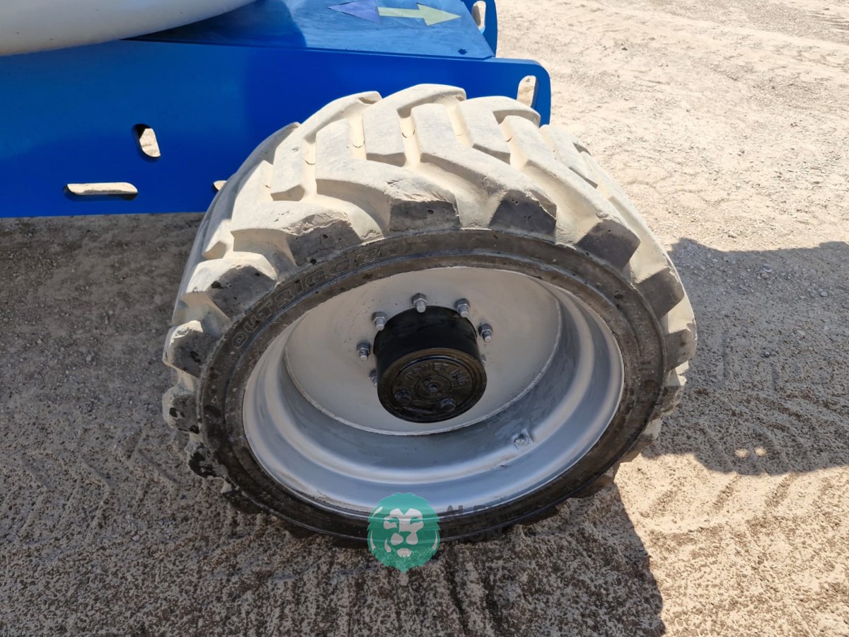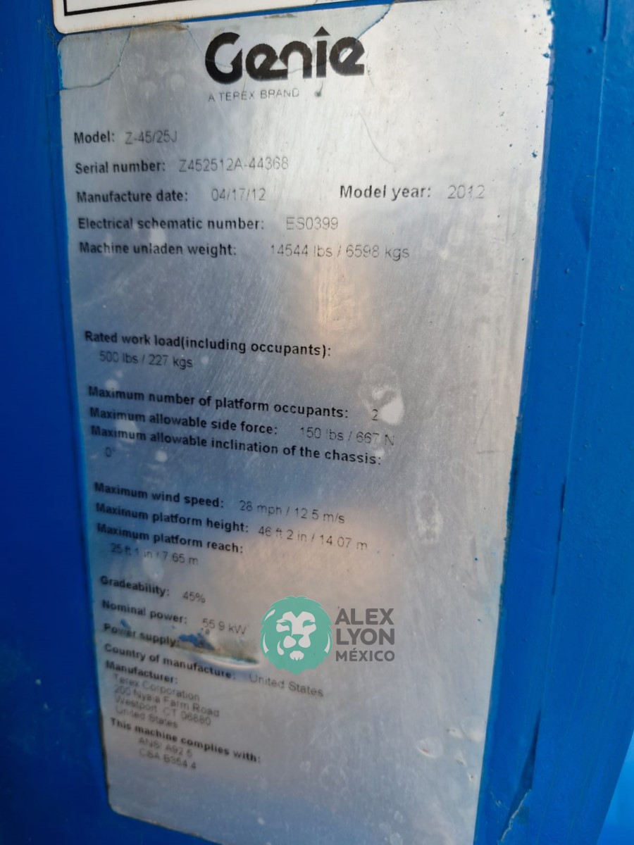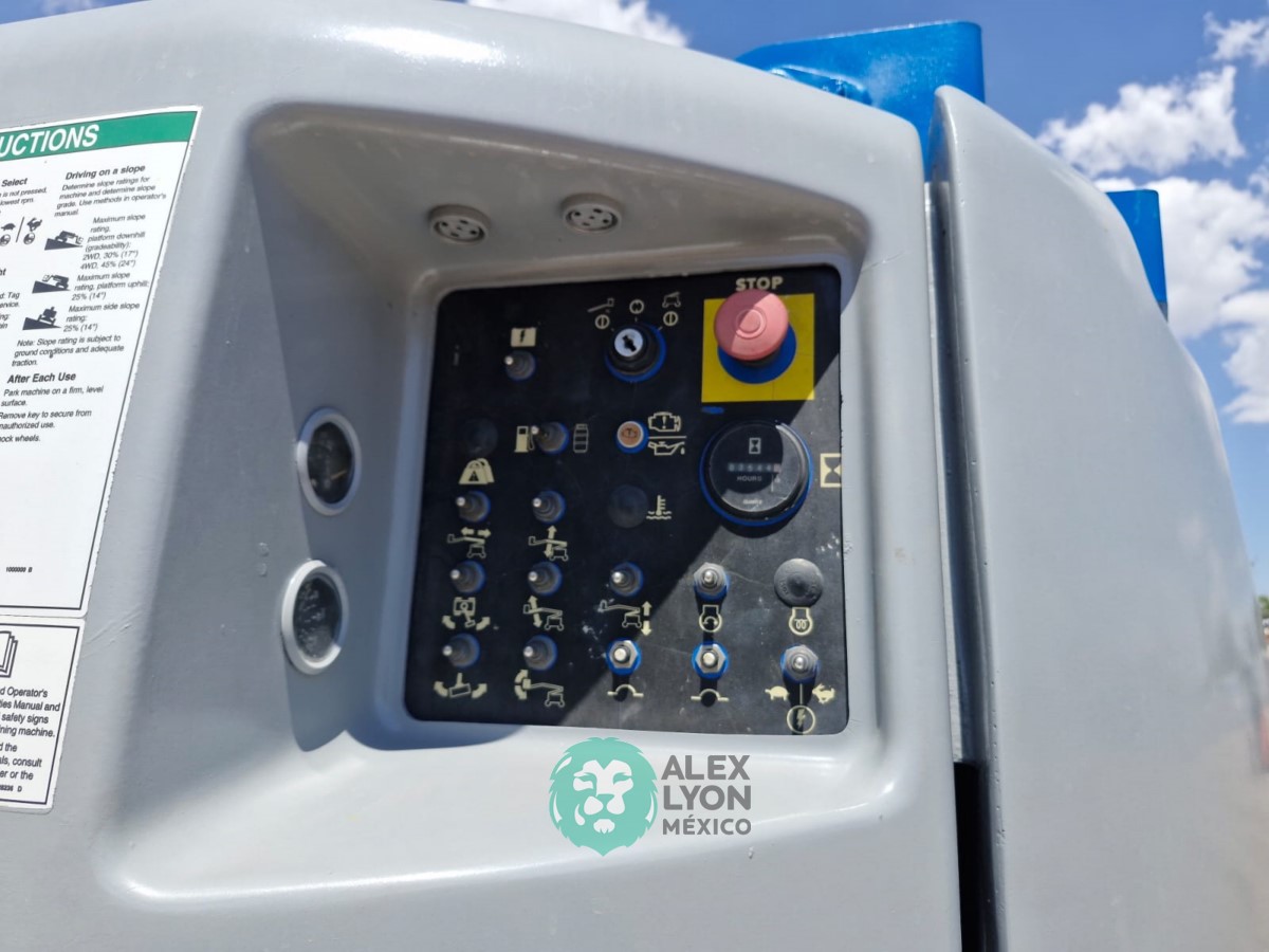 (V) ALTURA MAXIMA 45’/13.7 MTS. ALCANCE HORIZONTAL 25’/7.65 MTS. CAP. 500 LBS. MOTOR FORD 4 CIL. GASOLINA (59.9 HP), LLTS. 355/55D625. (3544 HRS)