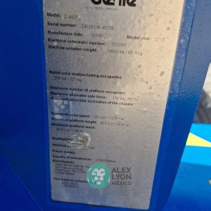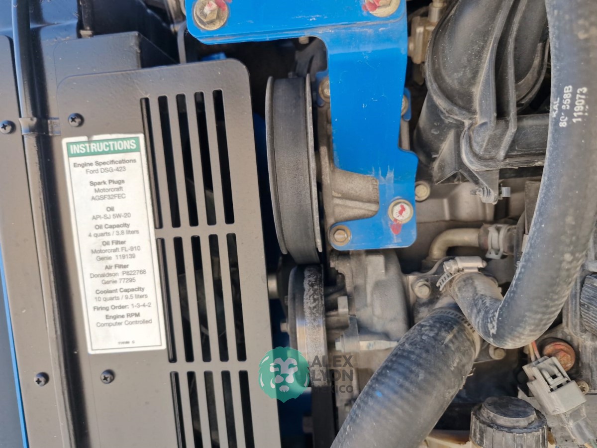 (V) 4X4 (DOBLE TRACCION), ALTURA MAXIMA 45’/14.07 MTS. ALCANCE HORIZONTAL 25’/7.65 MTS. CAP. 500 LBS. MOTOR FORD 4 CIL. GAS L.P./GASOLINA, LLTS. 355/55D625. (5115 HRS)