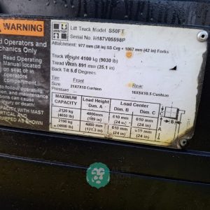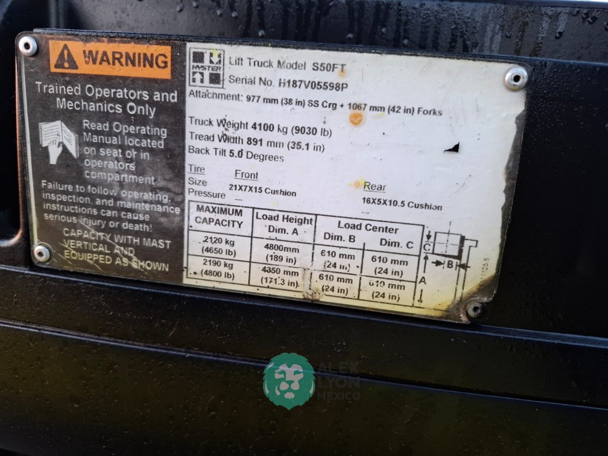(V) CAP. 4800 LBS. TORRE 3 SECCIONES C/DESPLAZAMIENTO LATERAL, CASETA, MOTOR’ 4 CIL. GAS LP. (62 HP), LLTS. SOLIDAS 21X7X15 Y 16X6X10. (30565 HRS)