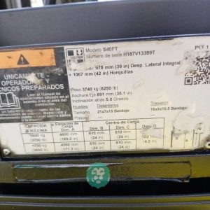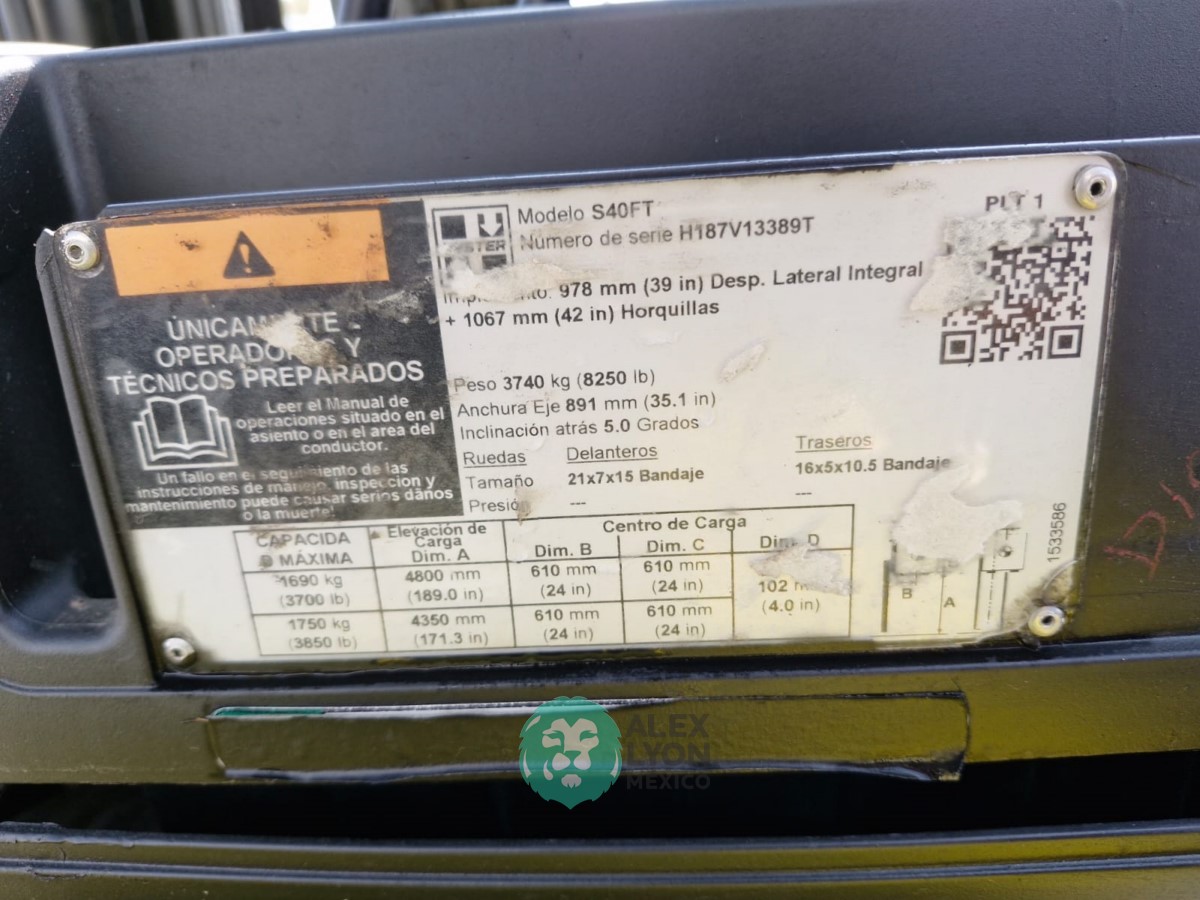CAP. 3850 LBS. TORRE 3 SECCIONES C/DESPLAZAMIENTO LATERAL, CASETA, MOTOR’ 4 CIL. GAS LP. (44 HP), LLTS. SOLIDAS 21X7X15 Y 16X6X10. (16295 HRS)