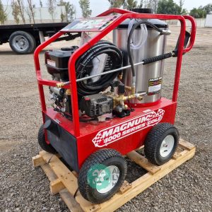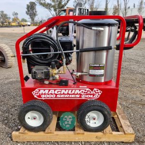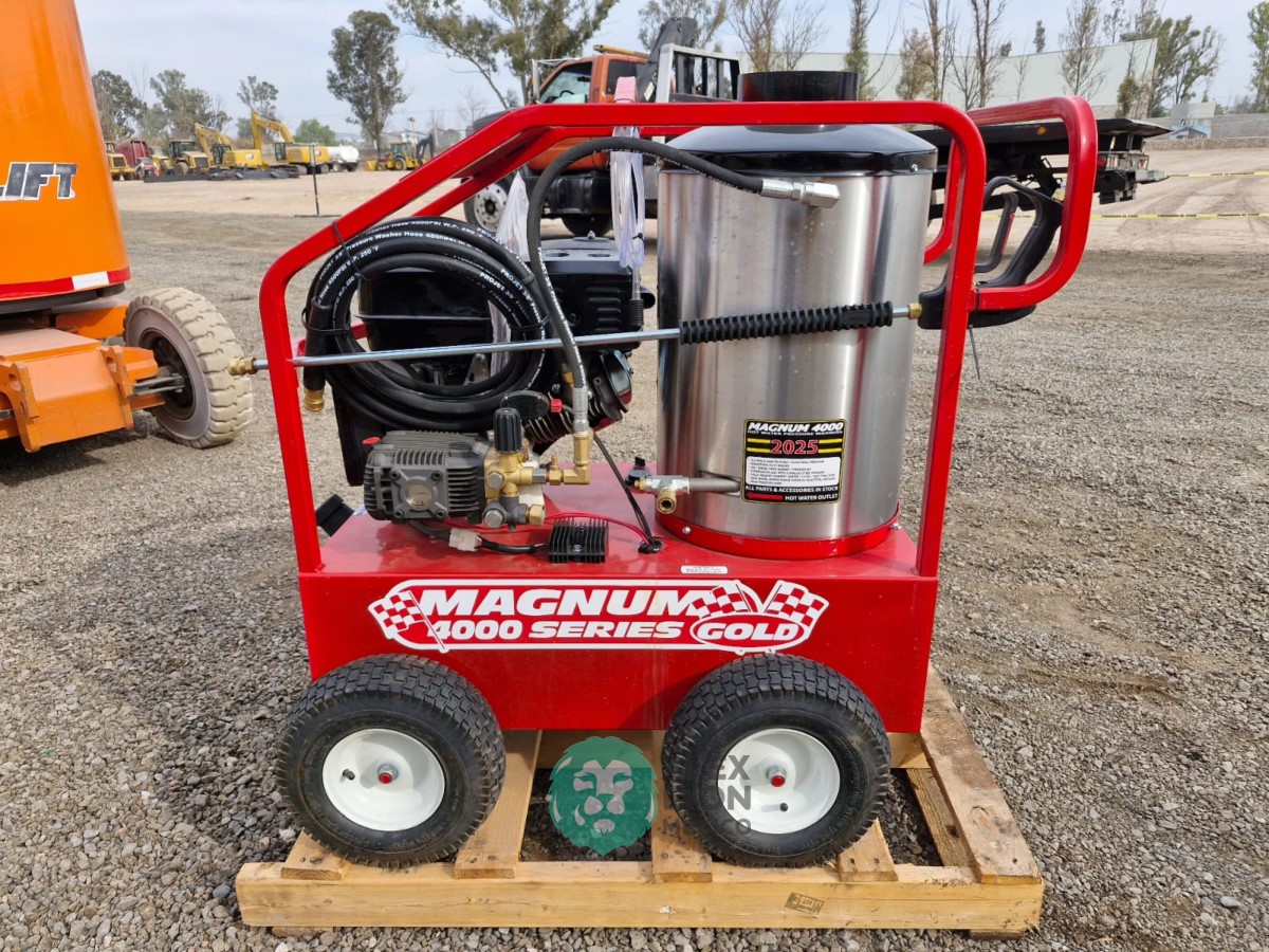 CAP. 4000 PSI, 3.5 GPM. MOTOR 15 HP. GASOLINA 4 TIEMPOS, CON CALDERA PARA AGUA CALIENTE, TANQUE 10 GAL. CON REGULADOR DE PRESION Y TEMPERATURA, LLTS. 13X5.00-6. (INCLUYE PISTOLA, MANGUERA PARA AGUA, MANGUERA PARA INYECCION EXTERNA DE QUIMICOS, BOQUILLA Y JUEGO DE LLAVES)