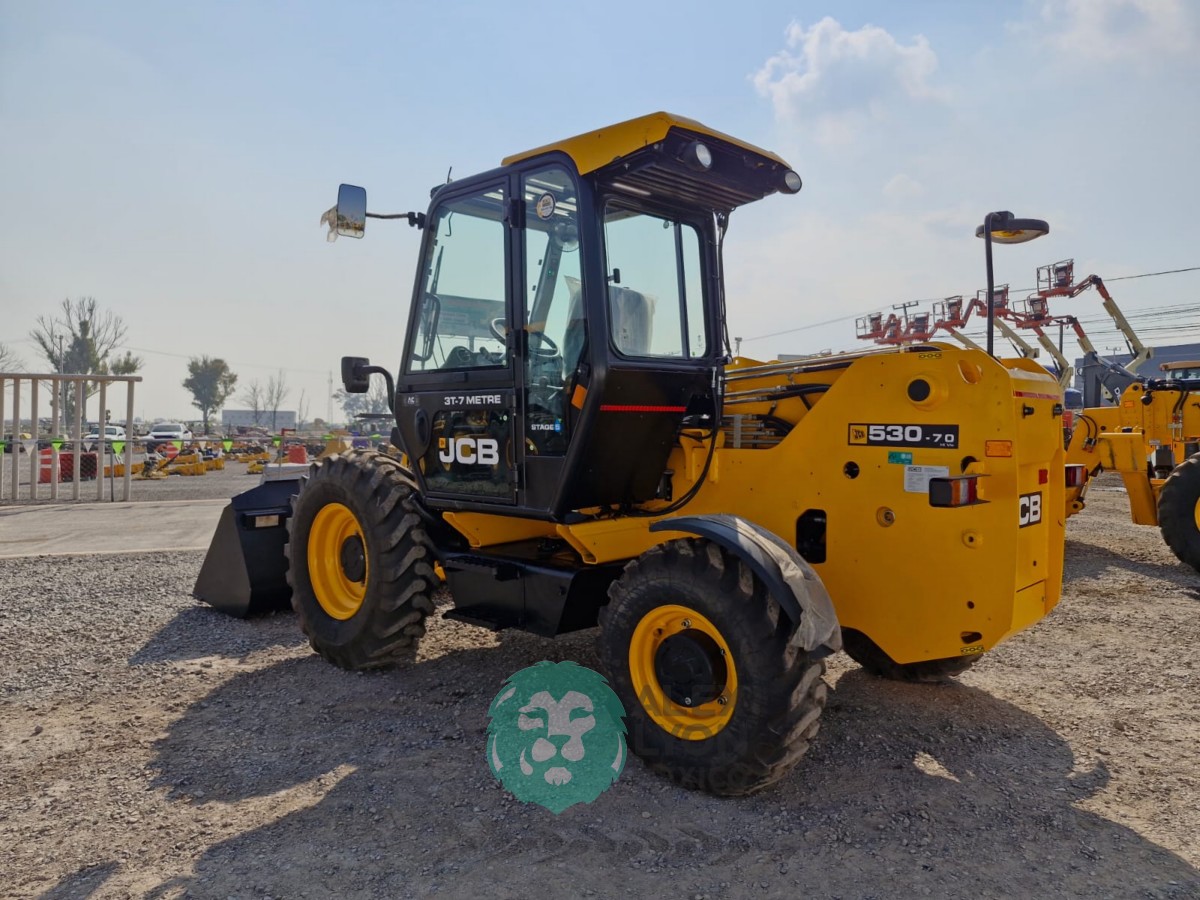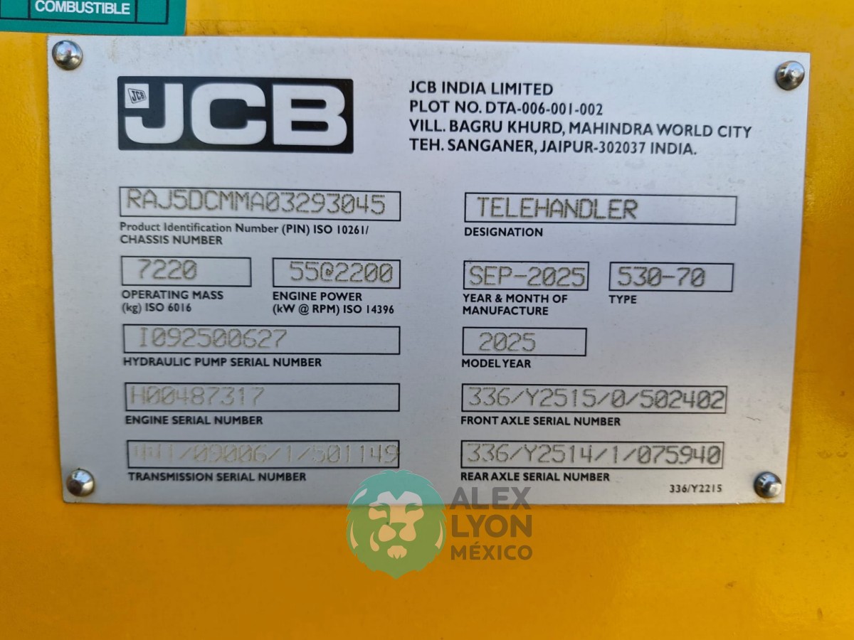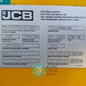 (V) CAP. 6000 LBS. 4X4 (DOBLE TRACCION), BRAZO DE 2 SECCIONES, KIT HIDRAULICO, 2 HORQUILLAS DE 42″, CUCHARON DE USO GENERAL C/DIENTES, ALTURA MAXIMA DE 23’/7 MTS. CABINA C/CLIMA, MOTOR JCB 4 CIL. DIESEL C/TURBO (74 HP), ESTABILIZADORES FRONTALES, LLTS. 13.00-24 Y 12.5/80-18. (5.2 HRS) (NUEVO)