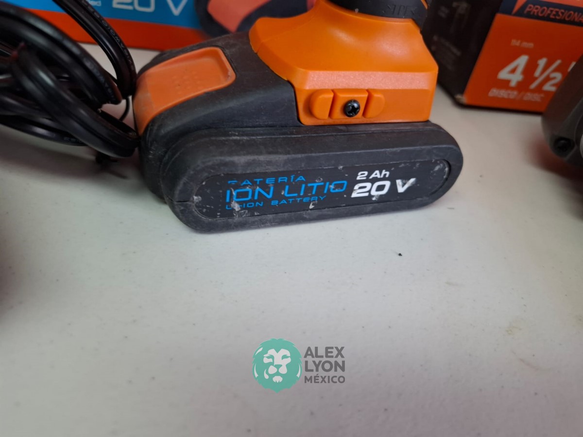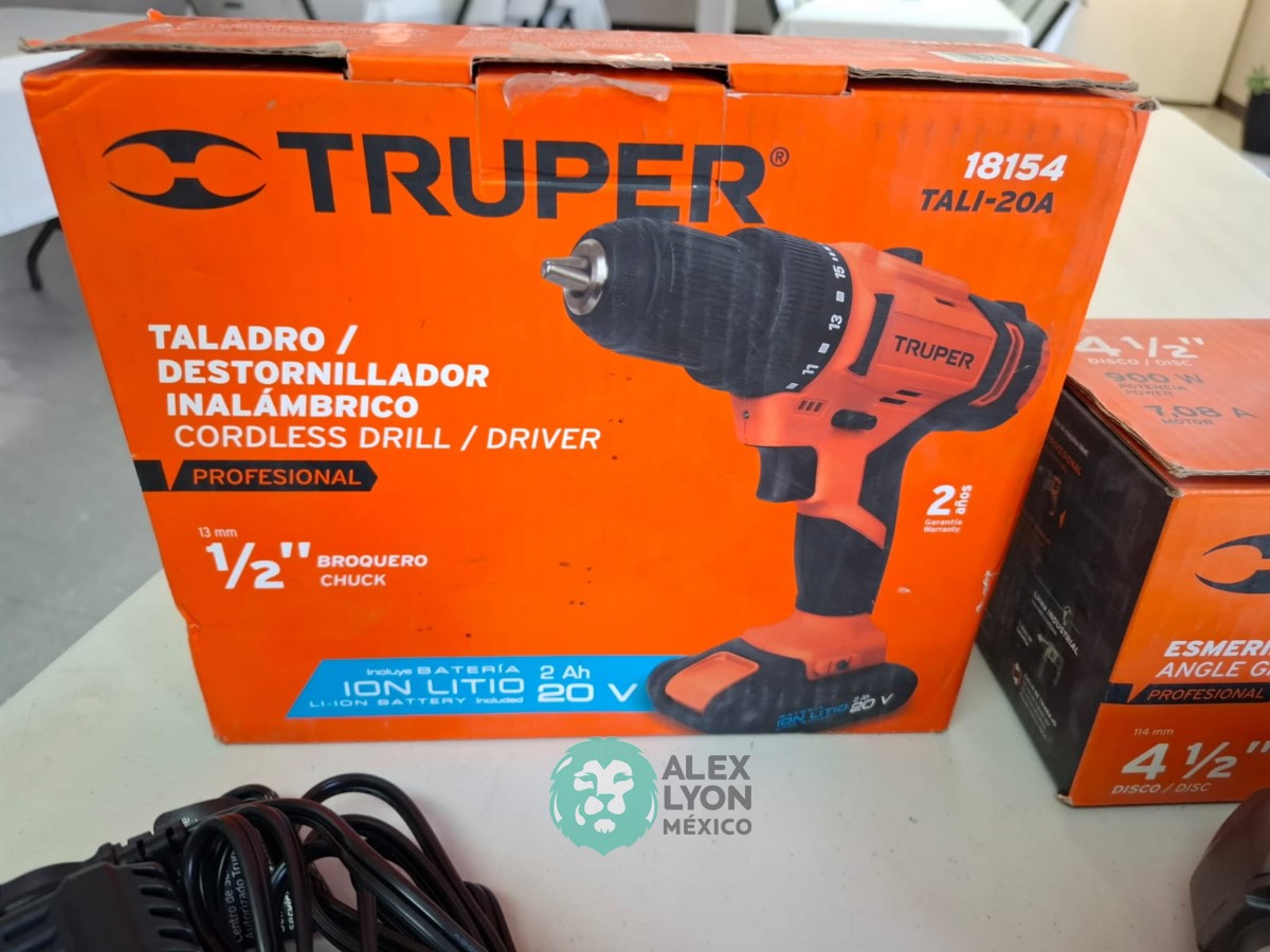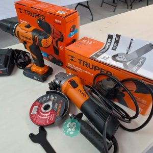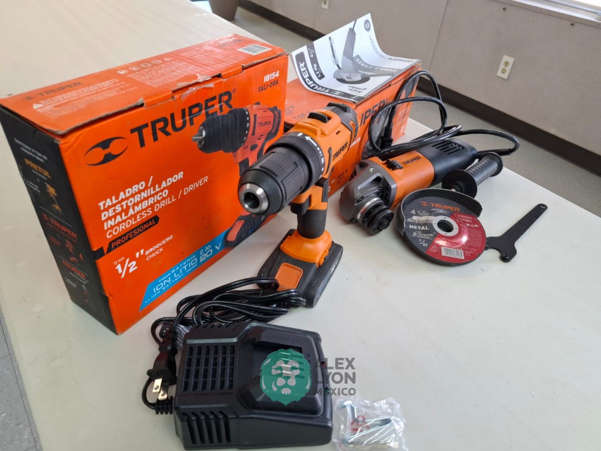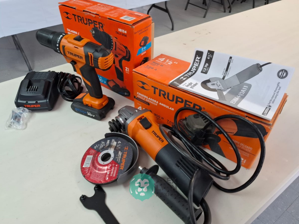 QUE INCLUYE (1) TALADRO DESTORNILLADOR INALAMBRICO, MODELO TALI-20A, S/N: 18154, BROQUERO DE 1/2″, BROQUERO DE CAMBIO RAPIDO, MAXIMO TORQUE, DOBLE ENGRANAJE PARA 2 VELOCIDADES, CLIP PARA CINTURON, LUZ LED. (INCLUYE CARGADOR DE BATERIAS Y BATERIA ION-LITIO DE 20 VOLTS) Y (1) ESMERILADORA ANGULAR, MODELO ESMA-4-1/2A11, SERIE: 16715, PROFESIONAL, PARA DISCOS DE 4 1/2″, POTENCIA DE MOTOR 900 WATTS, MOTOR DE 7.08 AMPS. VELOCIDAD 11000 RPM. CUERPO DELGADO Y ERGONOMICO, GUARDA DE AJUSTE RAPIDO, MANGO DE 3 POSICIONES. (INCLUYE DISCO DE 4 1/2″, GUARDA DE PROTECCION, MANGO AUXILIAR Y LLAVE DE DOS PUNTAS) (NUEVAS)
