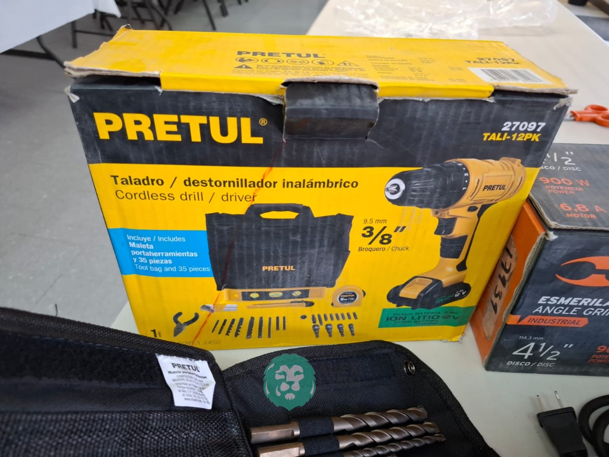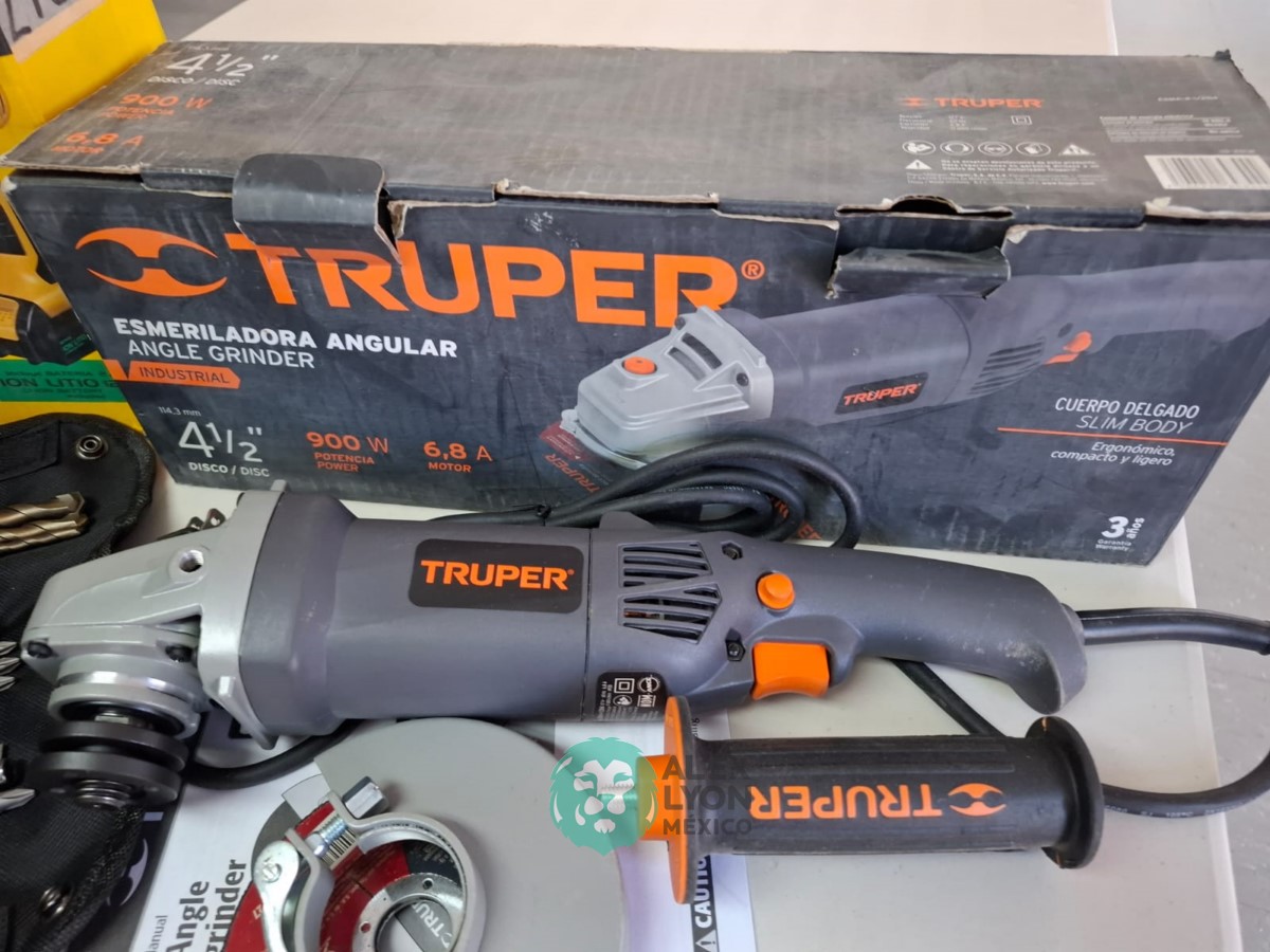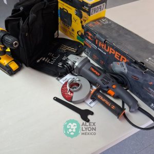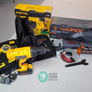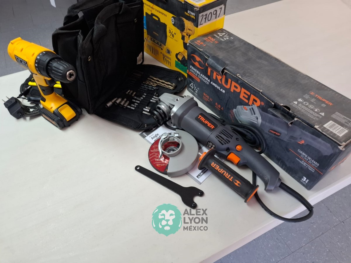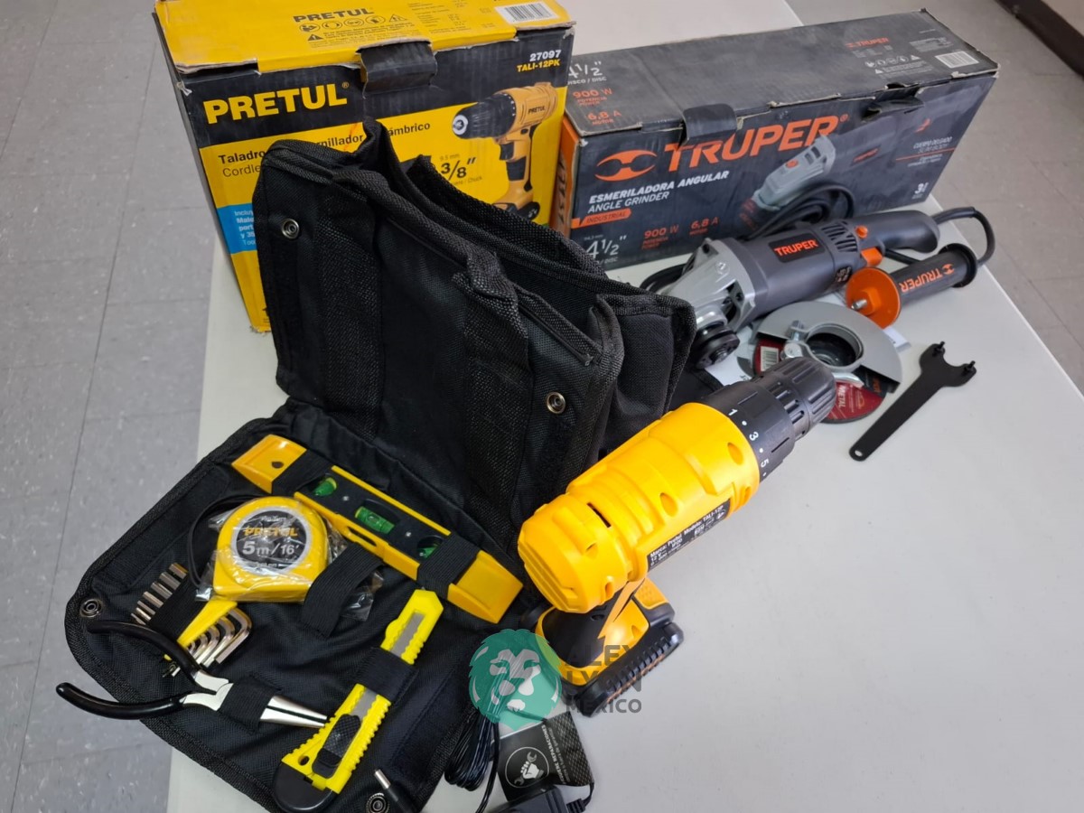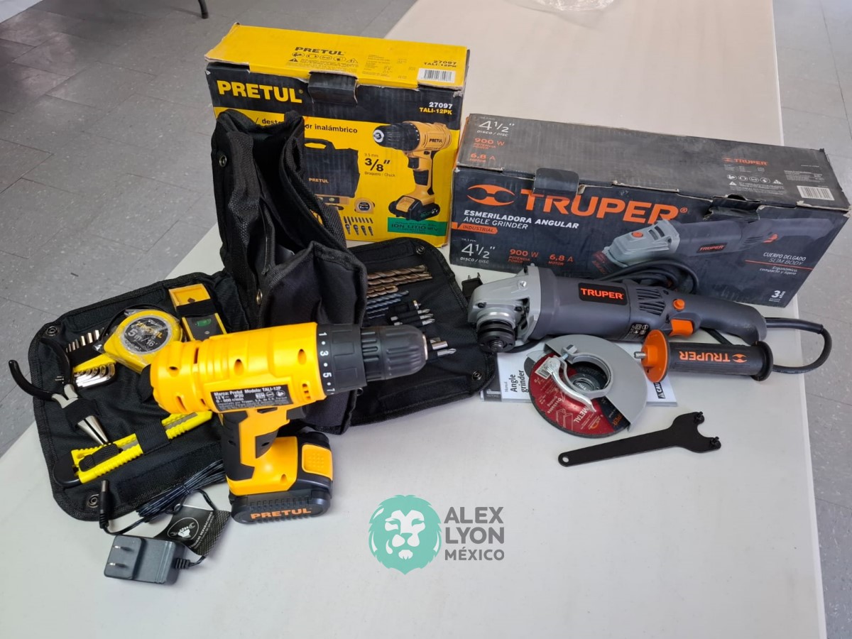 QUE INCLUYE (1) ESMERILADORA ANGULAR MARCA TRUPER, MODELO ESMA-4-1/2N4, S/N: 17939, PARA DISCOS DE 4 1/2″, MOTOR DE 6.8 AMPS. POTENCIA DE 900 WATTS. VELOCIDAD DE 11000 RPM. CUERPO DELGADO, MANGO DE 2 POSICIONES, GUARDA DE AJUSTE RAPIDO; Y (1) TALADRO DESTORNILLADOR MARCA PRETUL, MODELO TALI-12PK, S/N: 27097, INALAMBRICO, BROQUERO CON CAMBIO RAPIDO DE 3/8″, LUZ LED, BOTON DE CAMBIO DE DIRECCION, INDICADOR DE CARGA. (INCLUYE CARGADOR DE BATERIAS, BATERIA DE ION-LITIO DE 12 VOLTS. BROCAS, PUNTAS, PINZA, LLAVES ALLEN, NIVEL, FLEXOMETRO Y MALETA PORTAHERRAMIENTAS) (NUEVAS)