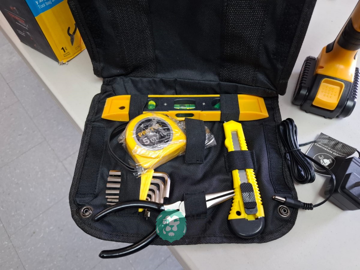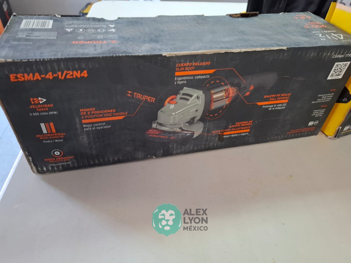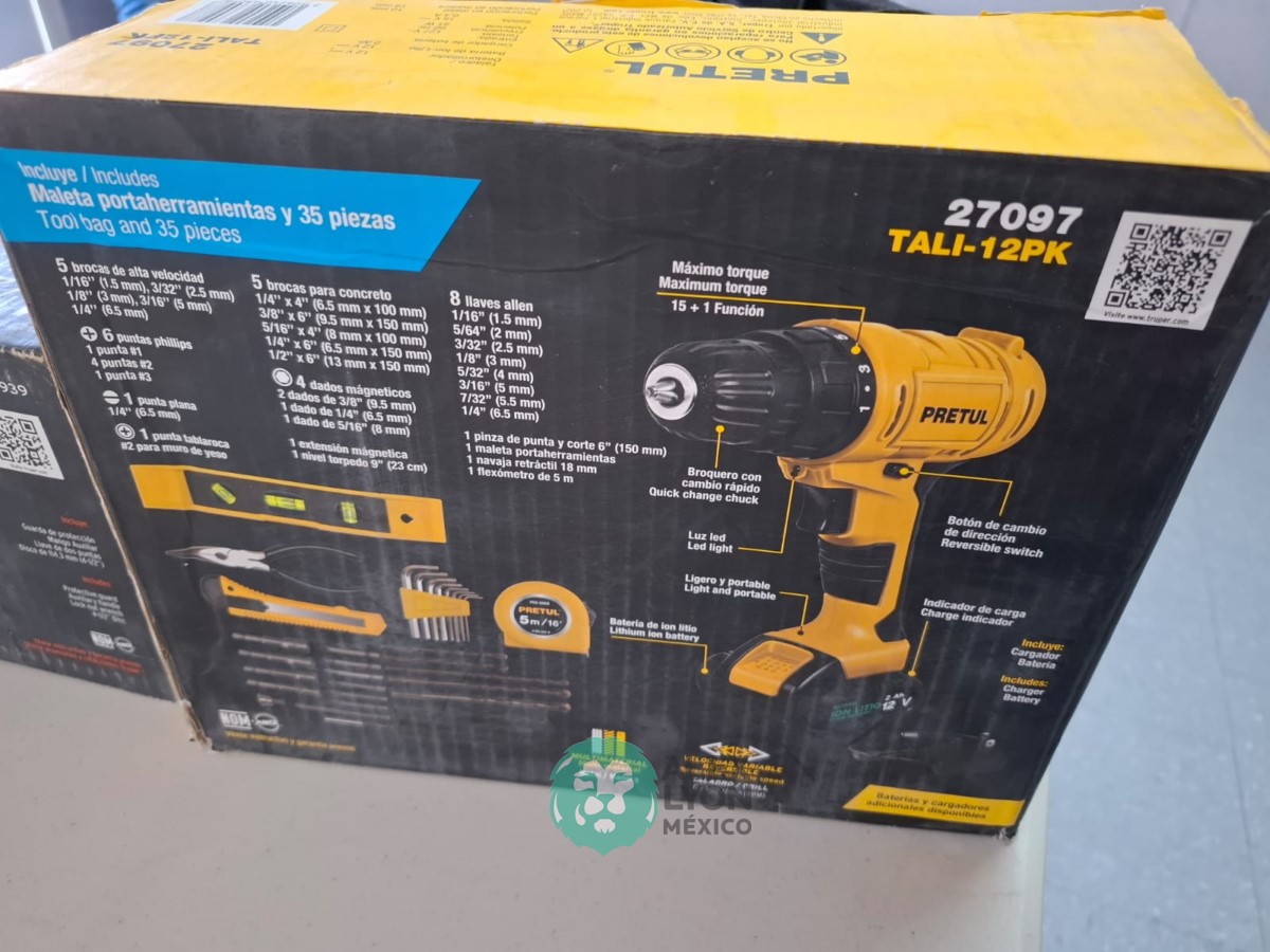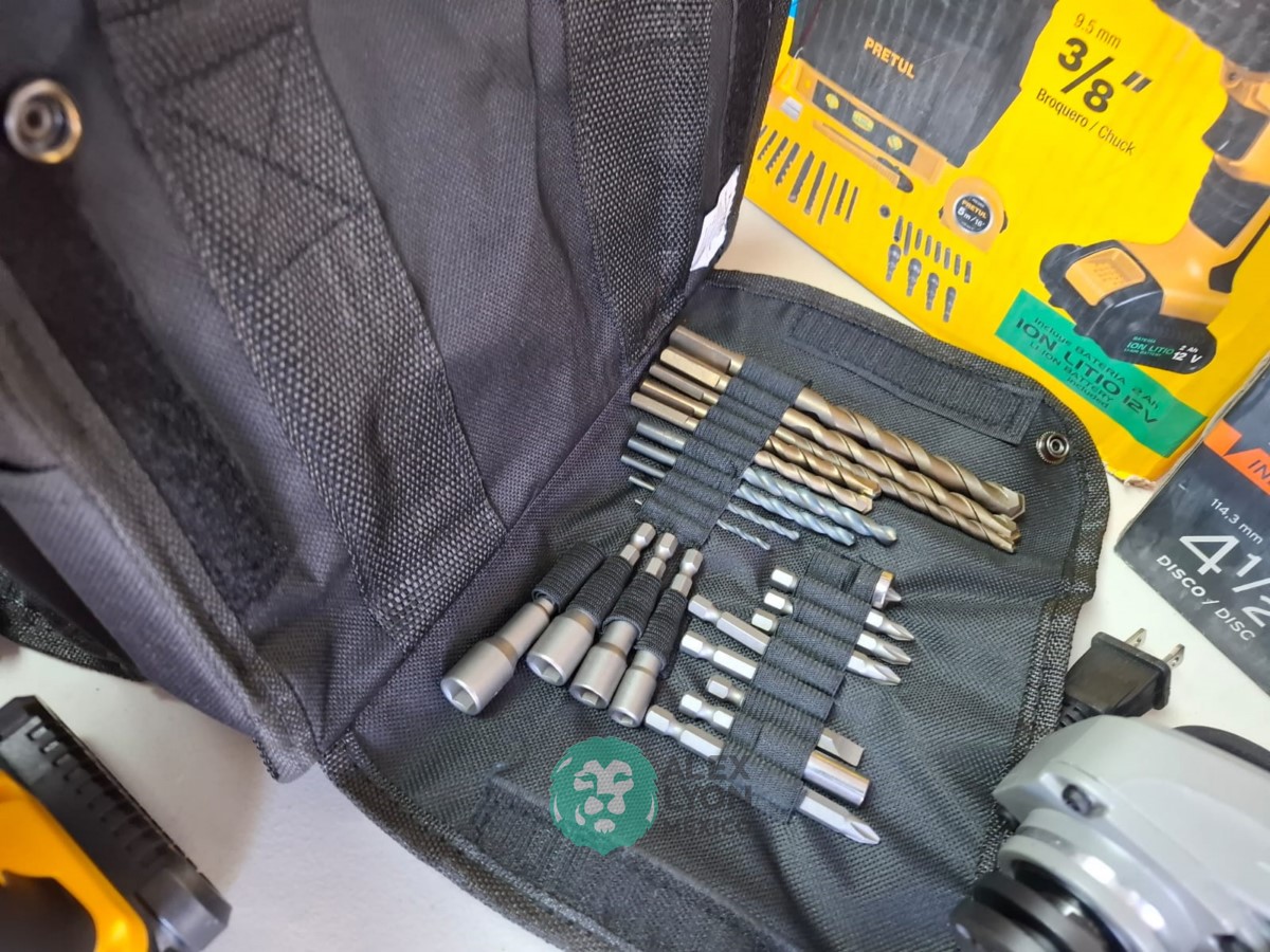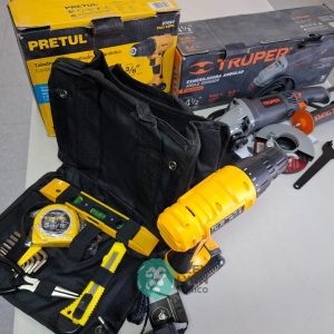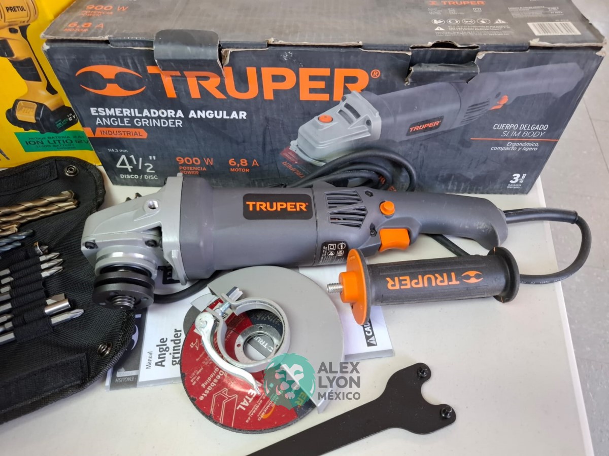 QUE INCLUYE (1) ESMERILADORA ANGULAR MARCA TRUPER, MODELO ESMA-4-1/2N4, S/N: 17939, PARA DISCOS DE 4 1/2″, MOTOR DE 6.8 AMPS. POTENCIA DE 900 WATTS. VELOCIDAD DE 11000 RPM. CUERPO DELGADO, MANGO DE 2 POSICIONES, GUARDA DE AJUSTE RAPIDO; Y (1) TALADRO DESTORNILLADOR MARCA PRETUL, MODELO TALI-12PK, S/N: 27097, INALAMBRICO, BROQUERO CON CAMBIO RAPIDO DE 3/8″, LUZ LED, BOTON DE CAMBIO DE DIRECCION, INDICADOR DE CARGA. (INCLUYE CARGADOR DE BATERIAS, BATERIA DE ION-LITIO DE 12 VOLTS. BROCAS, PUNTAS, PINZA, LLAVES ALLEN, NIVEL, FLEXOMETRO Y MALETA PORTAHERRAMIENTAS) (NUEVAS)