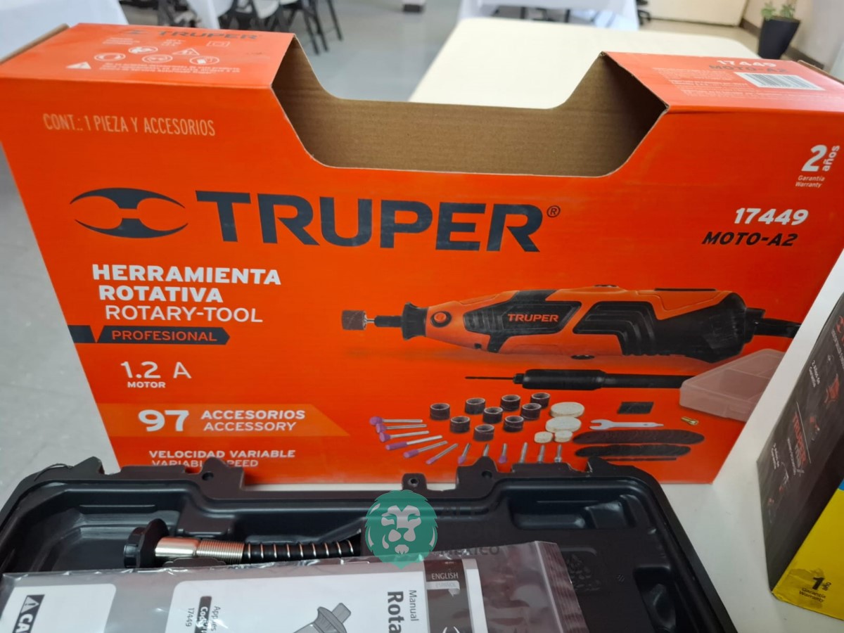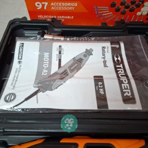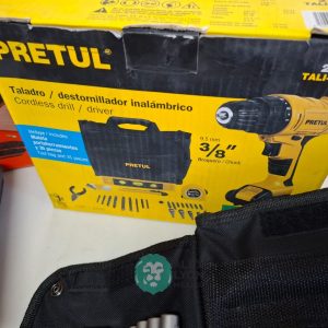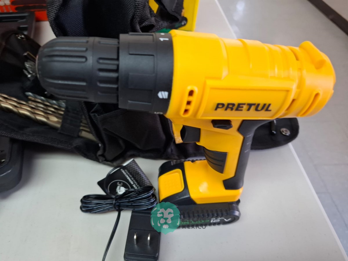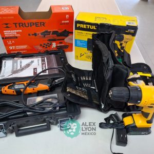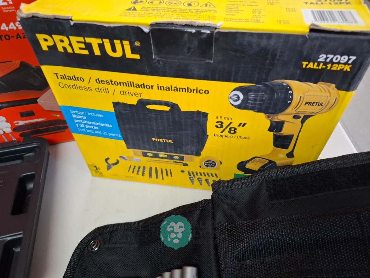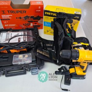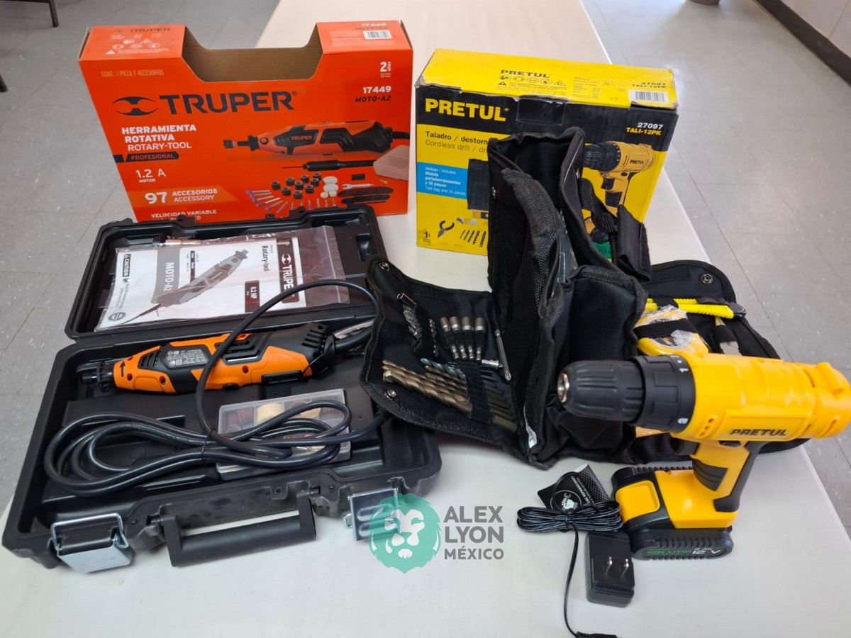 QUE INCLUYE (1) TALADRO DESTORNILLADOR MARCA PRETUL, MODELO TALI-12PK, S/N: 27097, INALAMBRICO, BROQUERO CON CAMBIO RAPIDO DE 3/8″, LUZ LED, BOTON DE CAMBIO DE DIRECCION, INDICADOR DE CARGA. (INCLUYE CARGADOR DE BATERIAS, BATERIA DE ION-LITIO DE 12 VOLTS. BROCAS, PUNTAS, PINZA, LLAVES ALLEN, NIVEL, FLEXOMETRO Y MALETA PORTAHERRAMIENTAS); Y (1) HERRAMIENTA ROTATIVA MODELO MOTO-A2, S/N: 17449, MOTOR DE 1.2 AMPS. POTENCIA DE 150 WATTS. CARBONES REEMPLAZABLES, BOQUILLA DE 3 MM. VELOCIDAD VARIABLE, CONTROL DE VELOCIDAD, BOTON DE BLOQUEO, USOS DE CORTADORA, ESMERILADORA, LIJADORA, PULIDORA Y GRABADORA, (INCLUYE 97 ACCESORIOS Y ESTUCHE) (NUEVAS)
