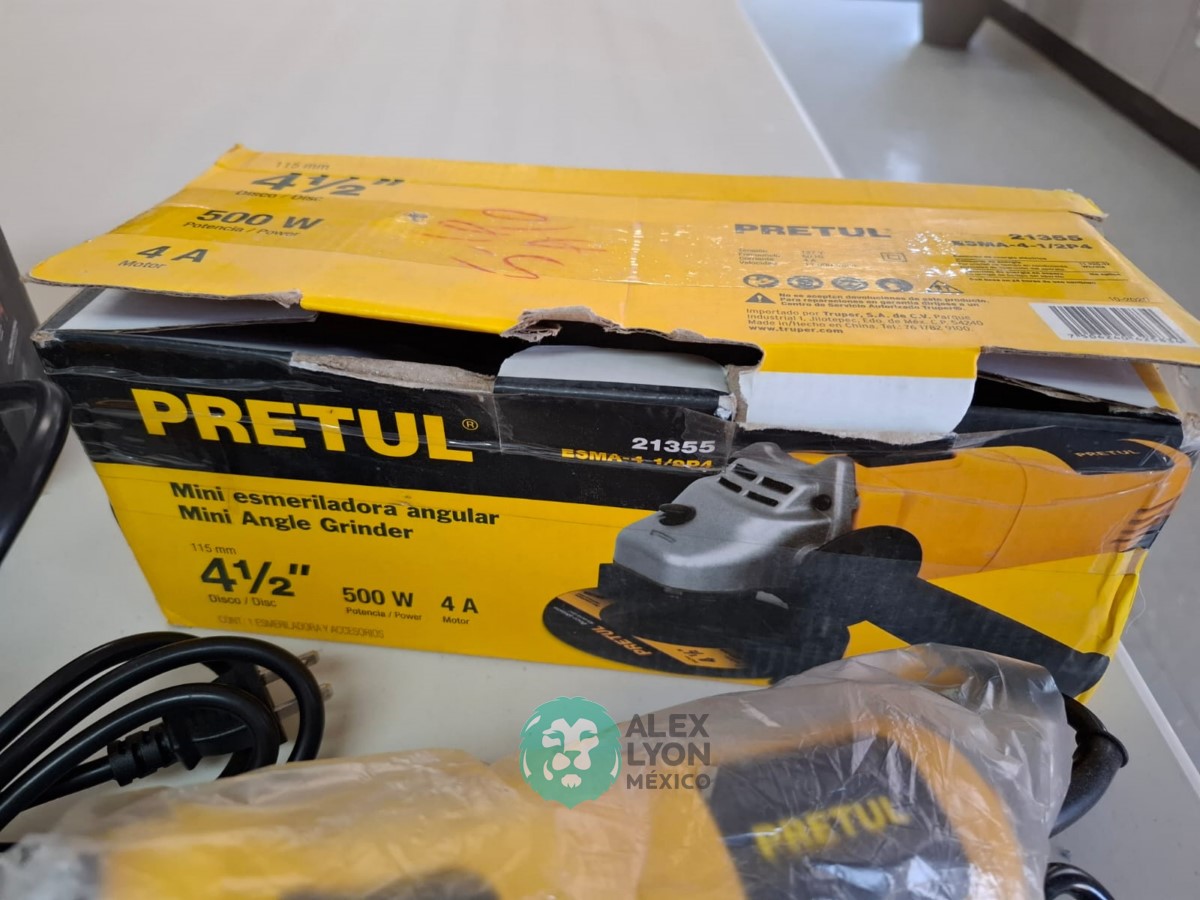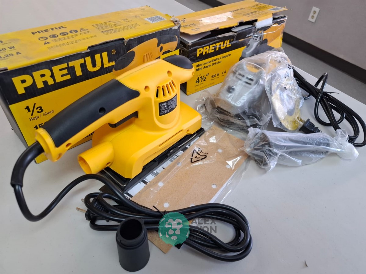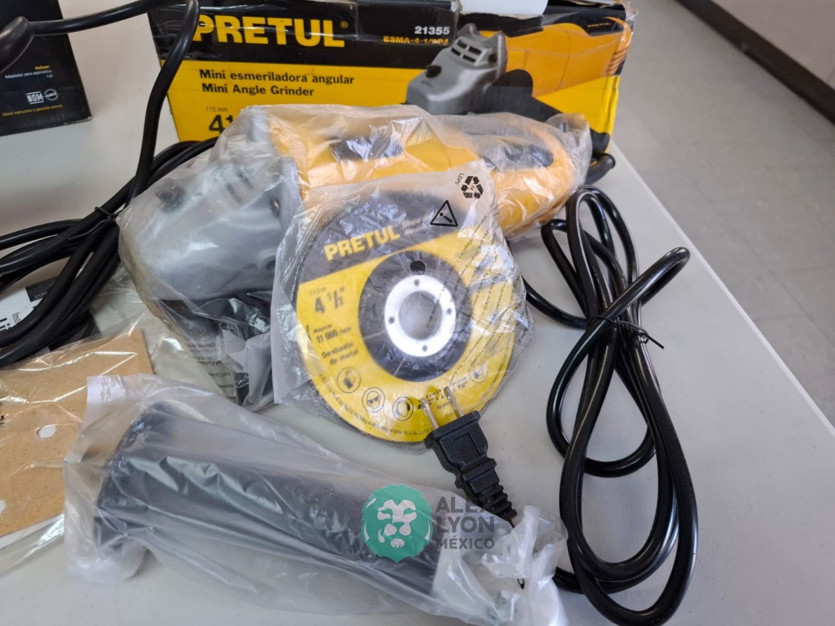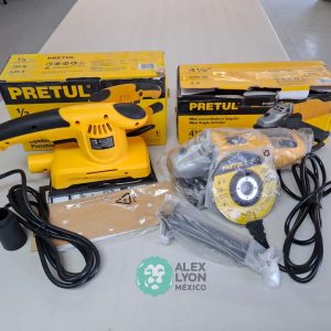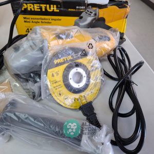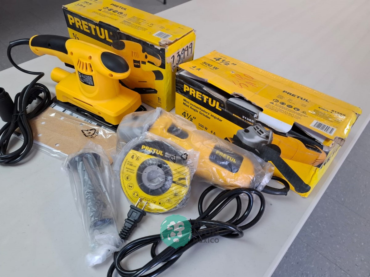 QUE INCLUYE (1) MINI ESMERILADORA ANGULAR, S/N: 21355, PARA DISCOS DE 4 1/2″, POTENCIA DE MOTOR DE 4 AMPS. 500 WATTS. 11000 RPM. 60 HZ. INTERRUPTOR Y BOTON DE USO CONTINUO, SEGURO DE FLECHA, MANGO AUXILIAR; (1) LIJADORA ORBITAL, S/N: 23999, HOJA DE 1/3″, ELECTRICA, 60 HZ. MOTOR DE 1.25 AMPS. 150 WATTS. BOTON DE USO CONTINUO, EMPUÑADORA FRONTAL, GRIP ANTI-DERRAPANTE, ADAPTADOR PARA ASPIRADORA, ALMOHADILLA DE LIJADORA, MORDAZAS PARA HOJA DE LIJA. (NUEVAS)