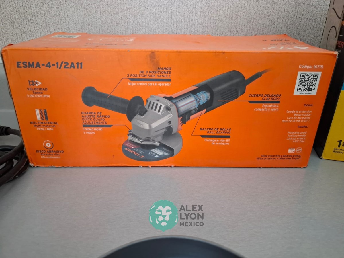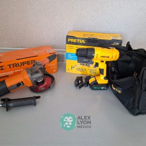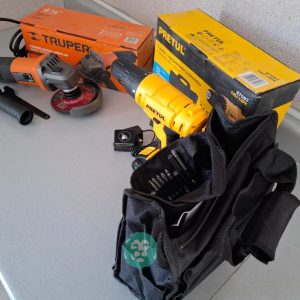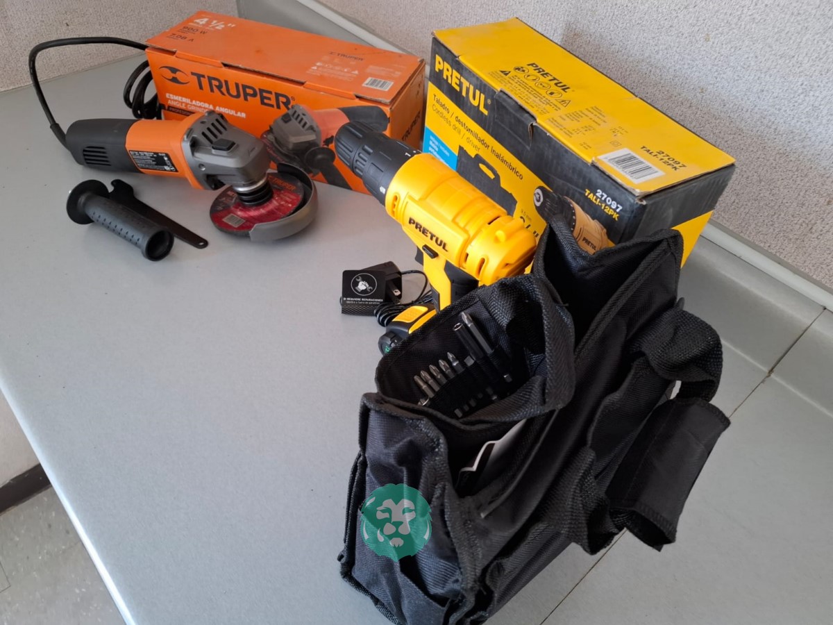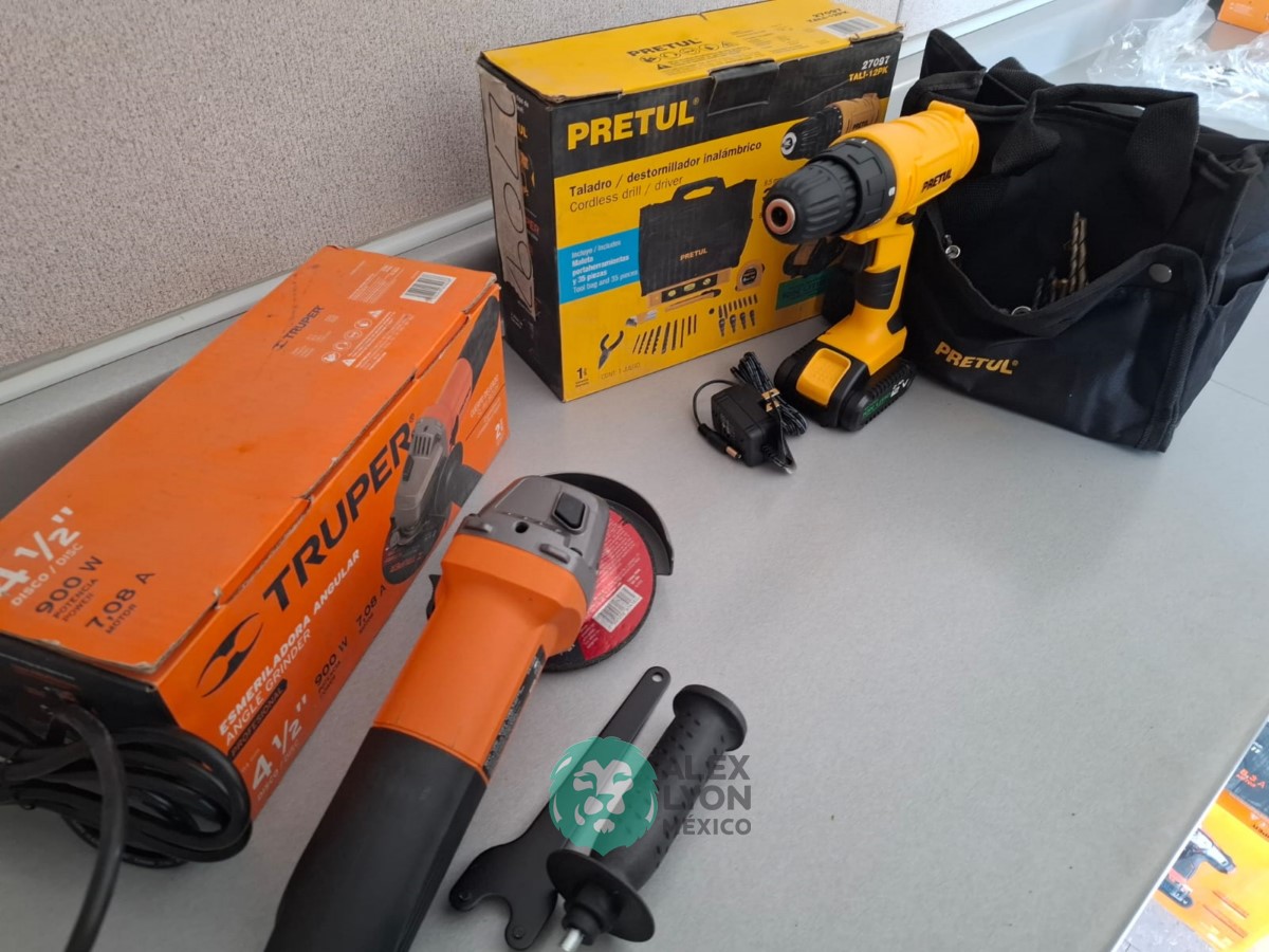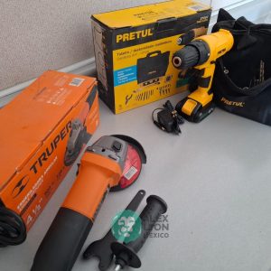QUE INCLUYE (1) ESMERILADORA ANGULAR, MODELO ESMA-4-1/2A11, SERIE: 16715, PROFESIONAL, PARA DISCOS DE 4 1/2″, POTENCIA DE MOTOR 900 WATTS, MOTOR DE 7.08 AMPS. VELOCIDAD 11000 RPM. CUERPO DELGADO Y ERGONOMICO, GUARDA DE AJUSTE RAPIDO, MANGO DE 3 POSICIONES. (INCLUYE DISCO DE 4 1/2″, GUARDA DE PROTECCION, MANGO AUXILIAR Y LLAVE DE DOS PUNTAS) Y (1) TALADRO DESTORNILLADOR MARCA PRETUL, MODELO TALI-12PK, S/N: 27097, INALAMBRICO, BROQUERO CON CAMBIO RAPIDO DE 3/8″, LUZ LED, BOTON DE CAMBIO DE DIRECCION, INDICADOR DE CARGA. (INCLUYE CARGADOR DE BATERIAS, BATERIA DE ION-LITIO DE 12 VOLTS. BROCAS, PUNTAS, PINZA, LLAVES ALLEN, NIVEL, FLEXOMETRO Y MALETA PORTAHERRAMIENTAS) (NUEVAS)