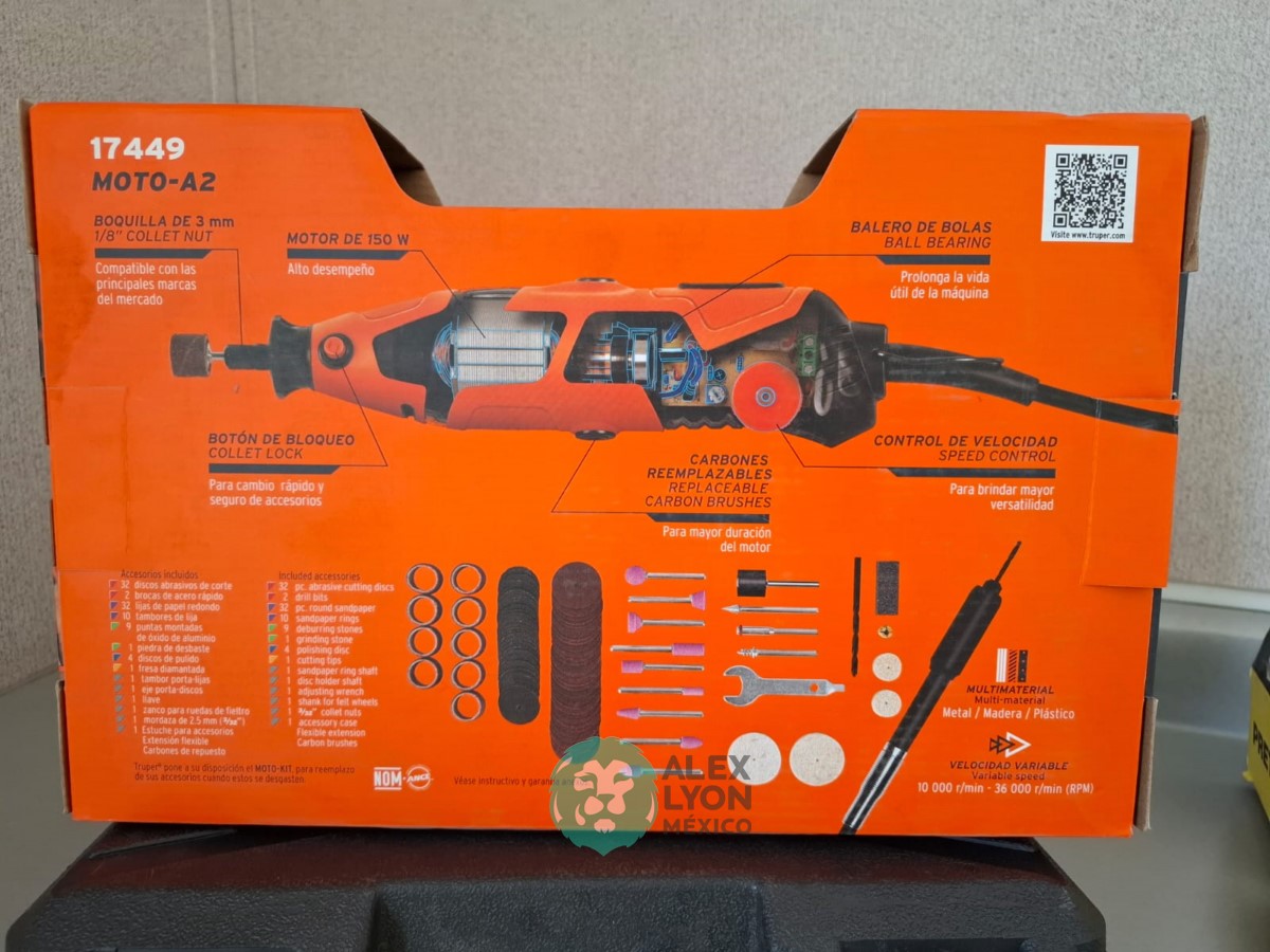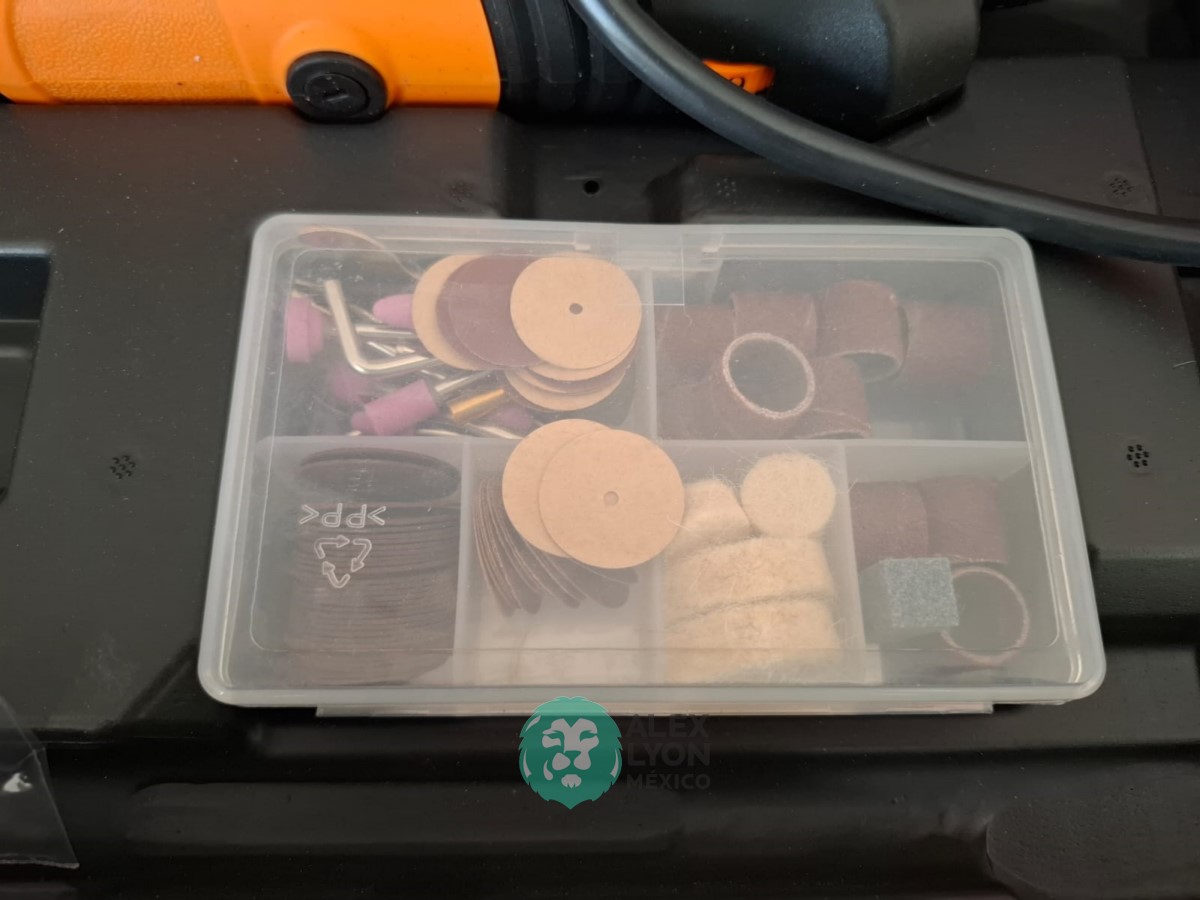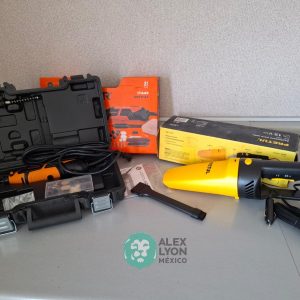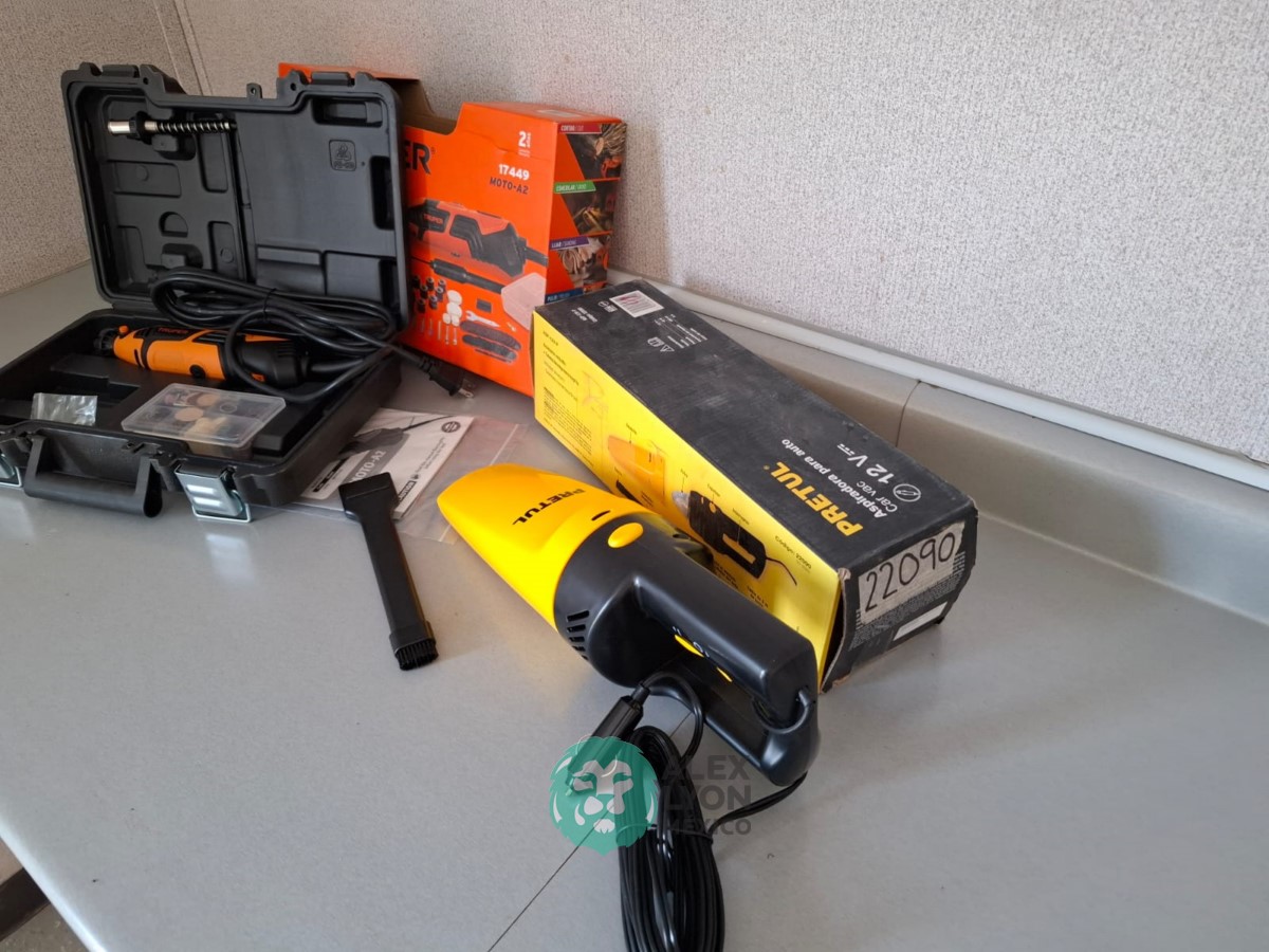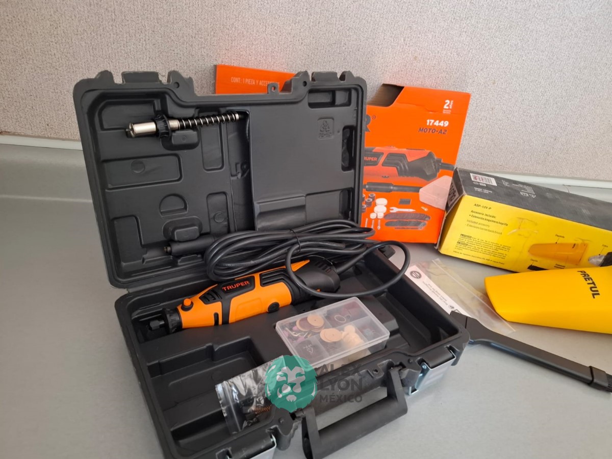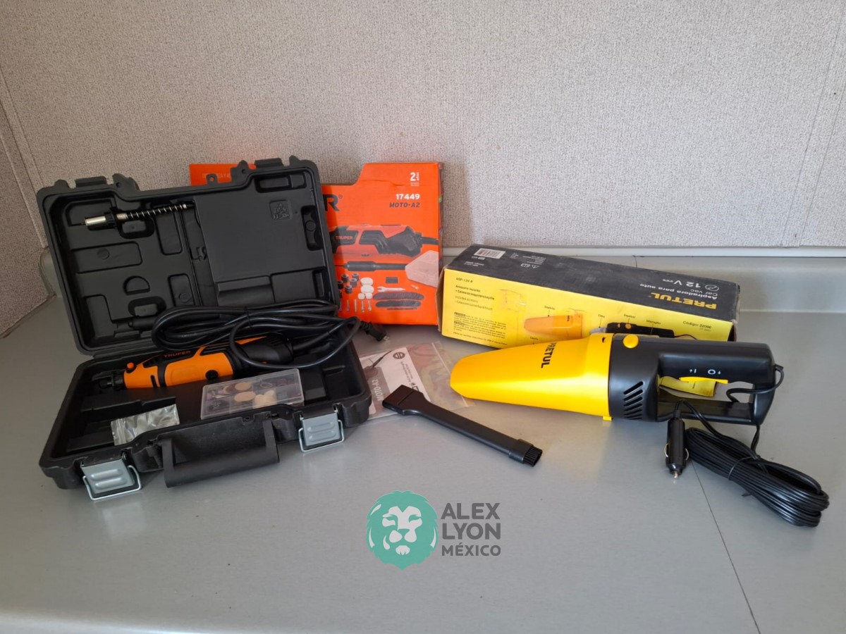 QUE INCLUYE (1) HERRAMIENTA ROTATIVA MODELO MOTO-A2, S/N: 17449, MOTOR DE 1.2 AMPS. POTENCIA DE 150 WATTS. CARBONES REEMPLAZABLES, BOQUILLA DE 3 MM. VELOCIDAD VARIABLE, CONTROL DE VELOCIDAD, BOTON DE BLOQUEO, USOS DE CORTADORA, ESMERILADORA, LIJADORA, PULIDORA Y GRABADORA, (INCLUYE 97 ACCESORIOS Y ESTUCHE) Y (1) ASPIRADORA ELECTRICA PARA AUTO, CONECTOR DE 12 VOLTS. CABLE DE 5 M. DE LARGO, FILTRO LAVABLE Y REUTILIZABLE, ESQUINERO PARA LIMPIAR ZONAS DIFICILES. (NUEVAS)