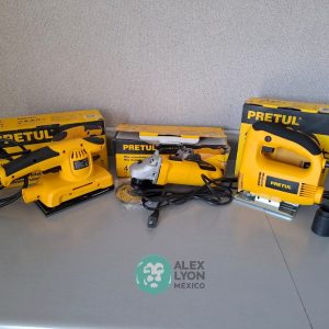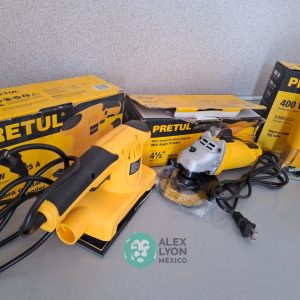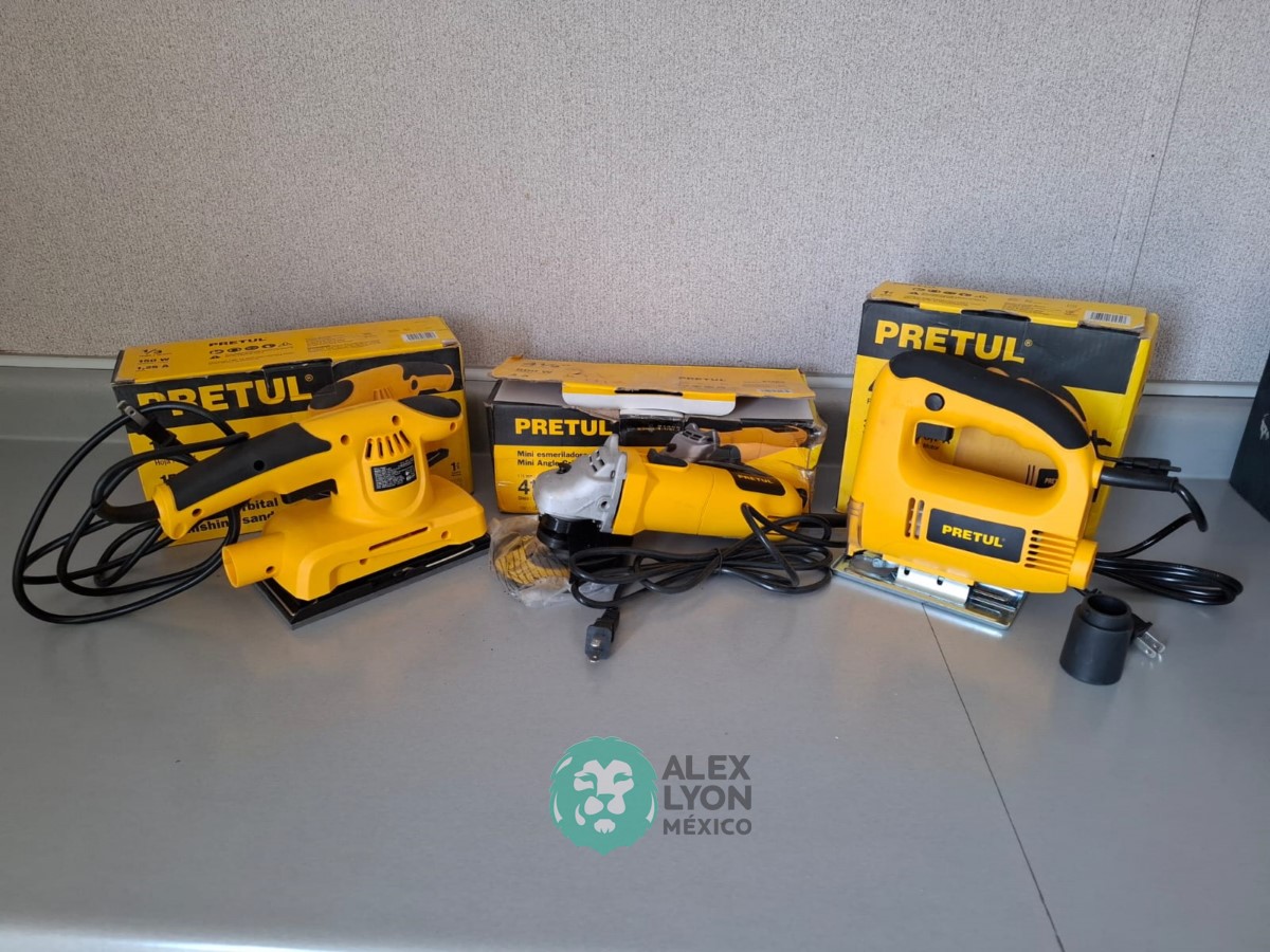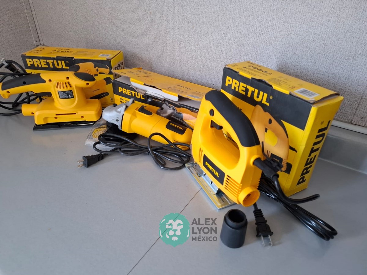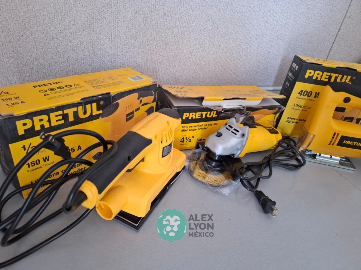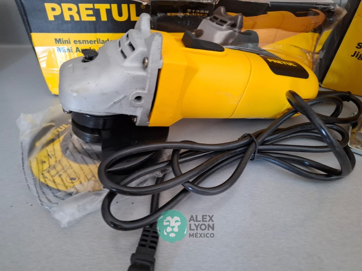 QUE INCLUYE (1) MINI ESMERILADORA ANGULAR, S/N: 21355, PARA DISCOS DE 4 1/2″, POTENCIA DE MOTOR DE 4 AMPS. 500 WATTS. 11000 RPM. 60 HZ. INTERRUPTOR Y BOTON DE USO CONTINUO, SEGURO DE FLECHA, MANGO AUXILIAR; (1) SIERRA CALADORA, S/N: 24047, MOTOR DE 3.1 AMPS. POTENCIA DE MOTOR DE 400 WATTS. VELOCIDAD 3000 RPM. INTERRUPTOR CON BOTON PARA TRABAJO CONTINUO, GUARDA PLASTICA, BASE AJUSTABLE HASTA 45 GRADOS, COLECTOR DE POLVO; (1) LIJADORA ORBITAL, S/N: 23999, HOJA DE 1/3″, ELECTRICA, 60 HZ. MOTOR DE 1.25 AMPS. 150 WATTS. BOTON DE USO CONTINUO, EMPUÑADORA FRONTAL, GRIP ANTI-DERRAPANTE, ADAPTADOR PARA ASPIRADORA, ALMOHADILLA DE LIJADORA, MORDAZAS PARA HOJA DE LIJA. (NUEVAS)